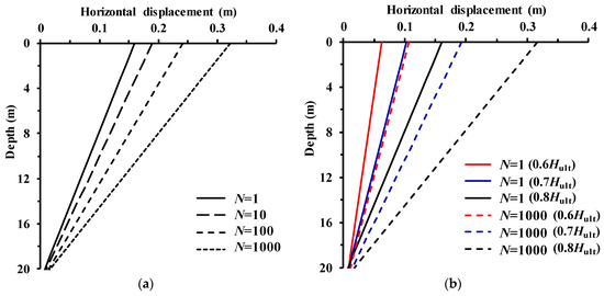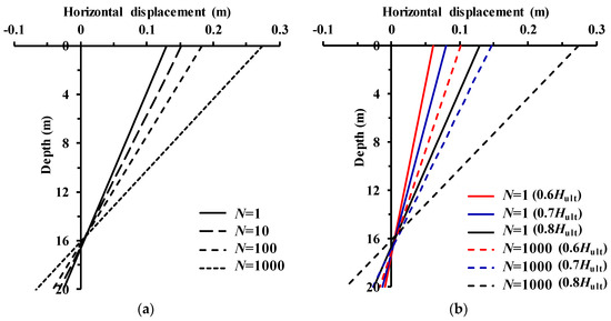 Evolution of the displacement of the pile as the development of a cyclic process (single-cylinder): (a) number of cycles (H = 0.8 Hult); (b) horizontal load amplitudes.