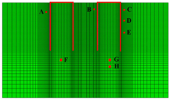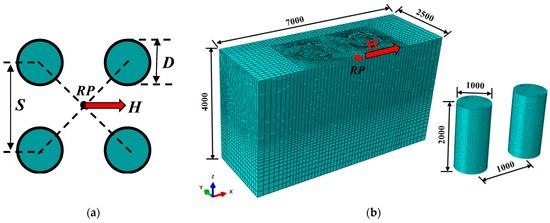 Furthermore, the numerical calculation model of the four-cylinder suction pile foundation was established. The plane layout of the four piles is shown in Figure 14a. It is assumed that the piles are rigidly connected by the top surface to constrain their relative displacement. The whole system was modeled by semi-structure, and symmetrical boundaries were applied on the symmetry plane [28]. The FE model and element division are shown in Figure 14b. The modeling process and method were similar to that of the single-cylinder foundation. The total number of elements was about 100,000.