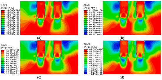 The elastic modulus was set as shown in Table 3. According to the field variables calculated by the degradation coefficient in the subroutine, the corresponding elastic modulus was obtained by interpolation and extrapolation. The initial elastic modulus was 5 MPa, and the corresponding field variable value and the degradation coefficient were 1. With the decrease in the degradation coefficient during the cyclic loading, the corresponding field variable value and the elastic modulus also decreased gradually.