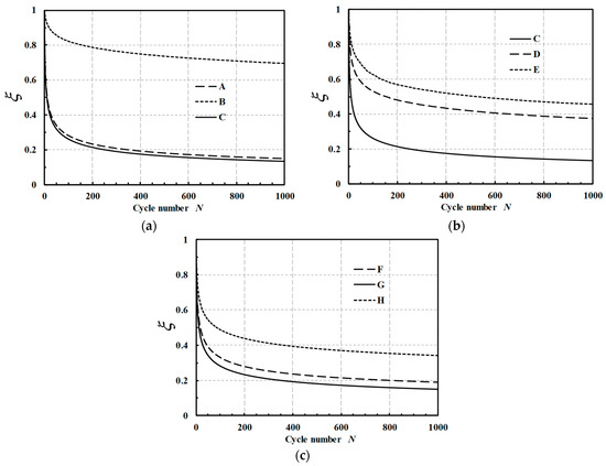 Degradation coefficient evolution rules with the development of a cyclic process (four-cylinder): (a) elements A~C; (b) elements C~E; (c) elements F~H.