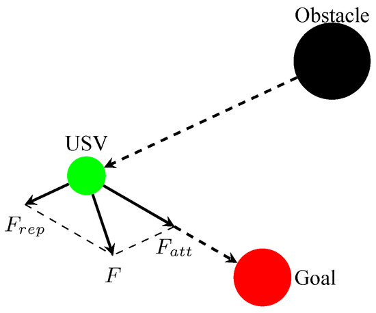 The goal point in the environment produces a gravitational potential field, guiding the USV toward it. Each obstacle in the environment produces a repulsive field, which in turn exerts a repulsive force on the USV, pushing the USV away from the obstacle. All the attractive forces produced by the goal and the repulsive forces produced by the obstacles generate a combined force, whose direction is the moving direction of the USV. A diagram of force analysis for an APF is depicted in Figure 1. is the attractive force generated by the goal, is the repulsive force generated by the obstacle, and F is the combined force.