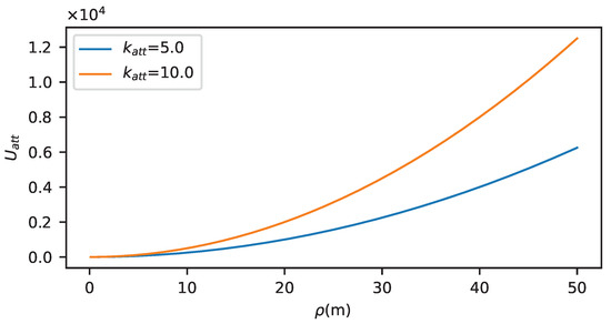 As the USV approaches the goal position, the potential field intensity generated by Equation (1) decreases, and the field intensity becomes 0 when it reaches the goal position. The potential fields generated with two different attractive gains are shown in Figure 2.