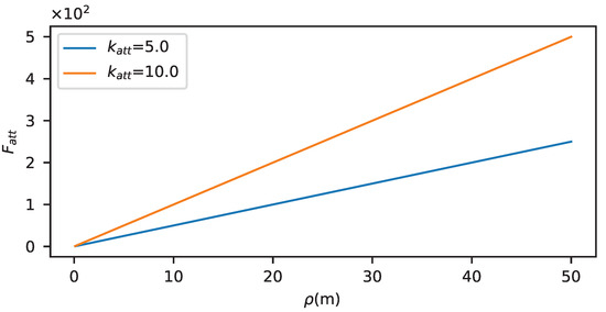 where is a vector whose direction is from to , ∇ is the gradient operator. The variation in the magnitude of with the distance d between the goal and the USV is illustrated in Figure 3. From Equation (2) and Figure 3, it can be observed that the force has a linear relationship with the distance when the potential field function is described using Equation (2).