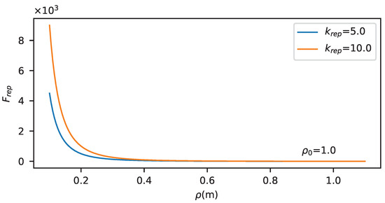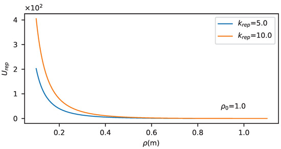 The intensity approaches infinity when approaches 0. When , the field intensity is 0. The potential fields generated by the two different repulsive gains and m are shown in Figure 4.