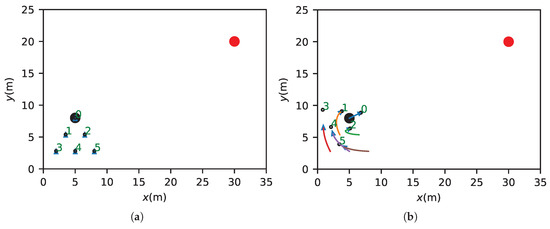 In Figure 10, the black solid circle represents the starting position of the formation, the red solid circle indicates the target position, the circle with numbers stands for the ideal position of the USV, the solid triangle depicts the actual position of the USV, the blue solid circle represents the obstacle, and the dashed circle means the limit distance of the obstacle.