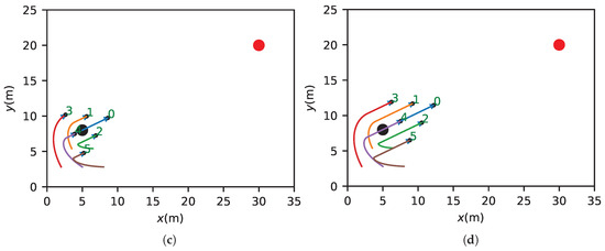 In Figure 9, the black solid circle represents the starting position of the formation, the red solid circle represents the target position, the circle with numbers indicates the ideal position of the USV, and the solid triangle stands for the actual position of the USV. Figure 9b–d depicts the formations of USVs after 20, 40, and 80 iterations. From the figures, it can be observed that the USV formation reached stability after a brief adjustment.
