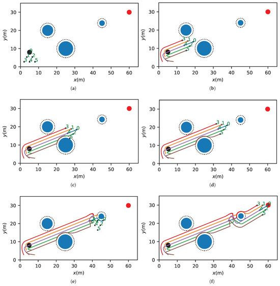 Figure 10b–f show the formations of the USVs after 150, 280, 350, 450, and 613 iterations. Figure 10f shows the final state of the USV formation after reaching its goal position. From the figures, it can be observed that the USV formation could effectively avoid obstacles and endeavored to maintain the stability of the formation during the movement.