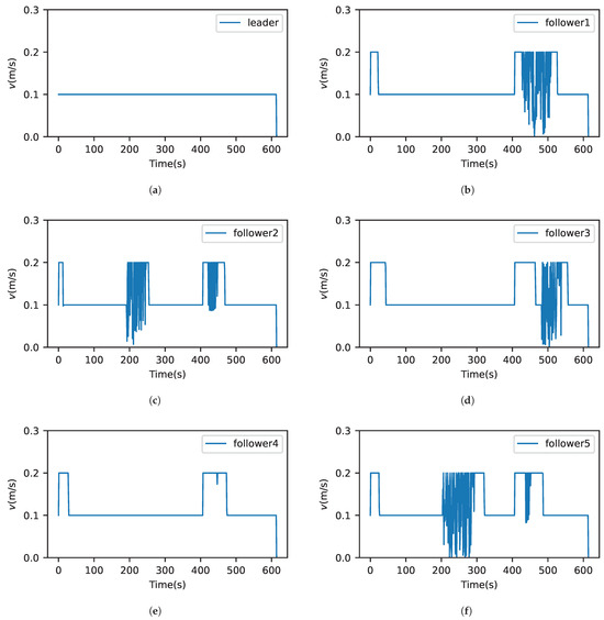 The varied linear speed of the USVs with respect to time. (a) Leader; (b) Follower 1; (c) Follower 2; (d) Follower 3; (e) Follower 4; (f) Follower 5.