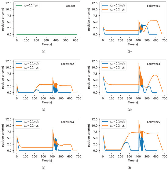 Comparison of positional errors of USVs at the different maximum linear speeds of 0.1 m/s and 0.2 m/s. (a) Position errors of the leader. The linear speed of the leader is = 0.1 m/s. = 0.1 m/s and = 0.2 m/s are the maximum linear speeds of the followers, not the linear speed of the leader; (b) position errors of the follower 1; (c) position errors of the follower 2; (d) position errors of the follower 3; (e) position errors of the follower 4; (f) position errors of the follower 5.