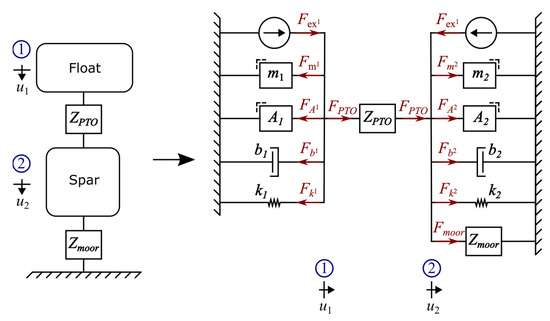 Working within the confines of a linear, inviscid, frequency-domain model, one can observe that aside from the excitation force, all forces are simply a function of the velocity of each body (with for the float and spar, respectively) and frequency . These dynamics can be represented as a mechanical circuit based on the same concepts employed in the study of electronic circuits. Force is selected as the through variable, and velocity is the across variable so that a velocity difference across a circuit element induces force through that element. In the frequency domain, forces are simply the product of an element’s mechanical impedance and the reference variable, which in this work is velocity. This is obvious for a damper, which is analogous to a resistor but also holds for masses and springs, with the caveat that they result in a phase shift and additional frequency dependence. The forces that result from the motion of each body are provided in Equations (1)–(4), where they equate to velocity multiplied by the impedance of the element. Radiation cross-coupling terms between the spar and float have not been included in this work to simplify calculations and maintain focus on the impact of mooring systems.