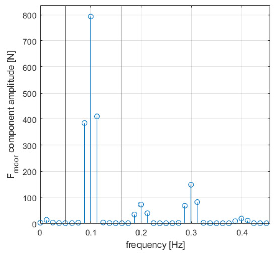 Viewing the frequency content of a typical force response in the range of interest using the fast Fourier transform (FFT) algorithm shows that the largest response is at the excitation frequency, but the mooring force has frequency content at higher frequencies, as shown in Figure 5. Despite the velocity input being a single-frequency sinusoid, the mooring force response contains many frequencies. This is due to the non-linear nature of the mooring, as discussed in [33,34].