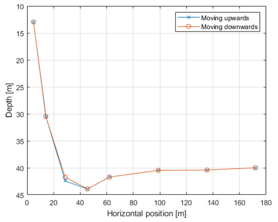 An aspect of the non-linear nature of slack moorings can be explained by the forces causing the motion of the mooring. When the spar is rising, the tension force in the mooring causes it to be picked up and pulled along quickly with the WEC, but when the WEC is sinking, the mooring cannot act in compression, and the only force pulling the mooring back down is gravity. The different forces driving the mooring motion cause a quick rise and a slower fall, as shown in Figure 6. In this example, the position of each node of the heavy catenary is plotted in the middle of downward and upward motion. The third mooring node is displaced by 0.75 m due to the mooring stretching from high tension, pulling it up. This repeating but uneven response shows up in the FFT as peaks at integer multiples of the excitation frequency, as seen in Figure 5.