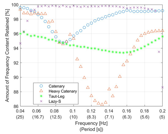 Percentage of total frequency content of mooring response retained by linearization for each mooring.