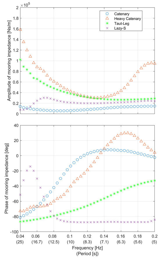 Inserting this and the observed velocity into Equation (18) determines the linearized impedance of the mooring. Note that this impedance is a complex number, and by comparing it to the mechanical circuit, one can better understand the mechanics in play. The real component defines the damping of the mooring and can be used to determine the associated energy loss. The reactive or imaginary component is less informative, as both mass and stiffness are complex when the reference variable is velocity. These components are why the linearized mooring force amplitude is approximated rather than the amplitude which has equivalent power loss as was carried out by [12]: one would be finding the “true” damping but could mischaracterize the mass and stiffness.