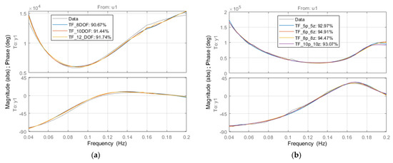 Although some insight into the mooring response has been found, the results are at discrete frequencies. This is sufficient for work within the frequency domain, but here, we choose to make a practical consideration for time-domain studies and control of the moored WEC. To do this requires a continuous frequency function that fits the discrete points, is stable, and preferably is also minimum-phase. Appropriate representations are state-space or transfer function models. Although state-space and transfer function models can be interchanged, the algorithms applied by system identification (SID) yield different results for the same inputs. In this work, the transfer function SID is more effective. The transfer function represents the impedance of the mooring and has a polynomial numerator and denominator, as shown in Equation (22).