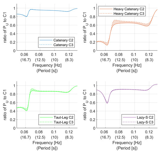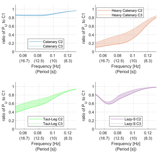 The difference in useful power caused by changing the control method has already been studied and discussed by [20], so the emphasis here is on the difference between the three cases for two specific control methods. The power generated by cases 2 and 3 was normalized against the power for case 1 and plotted as a percentage in Figure 11. For reference, the average order of magnitude of the case 1 power was approximately , with more detail on the unmoored power response of this SRPA available in [20]. The frequency range for this and the following figures was limited by the data available.