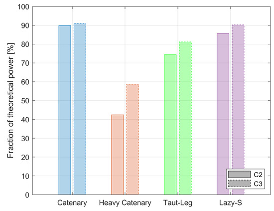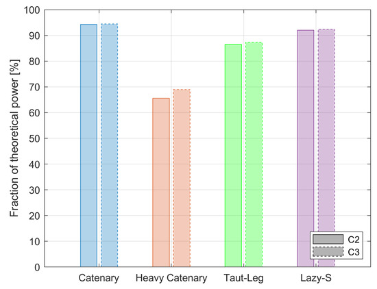 The results of Figure 11 and Figure 12 are intuitive if one considers the control concepts employed. In amplitude control, the power is maximized by setting the PTO damping coefficient to the intrinsic damping of the WEC. So, when the mooring impedance is not included in determining the PTO damping there is a mismatch due to the change in , and Equation (16) is no longer enforced. The same is true for complex conjugate control, but the effect is amplified by the real and complex parts both being set incorrectly. Not including the mooring model in Equation (17) yields a non-optimal control response and is not in resonance with the wave excitation, leading to lower power capture. This confirms that including the mooring within the early stage of the design process can enable a designer to make better decisions on how to improve the overall power capture of the WEC.