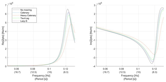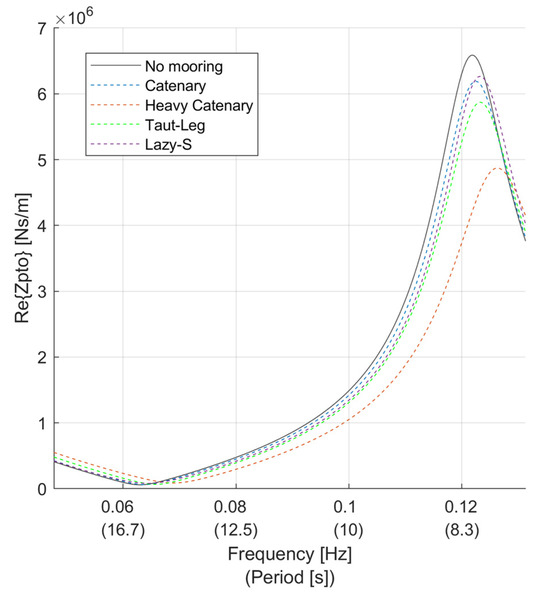 Finally, the effect of the moorings on the control of the PTO was investigated. The real and complex parts of the impedance were plotted for amplitude control and complex conjugate control in Figure 15 and Figure 16 respectively. The range of the PTO was not restricted by physical design limits to show the effect of the moorings at each frequency. Note that only case 3 was plotted as, by definition, case 2 had the same control as case 1.
