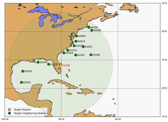 The target node is Buoy 41009, and other selected buoys should be as close to the target node as possible to capture real-time information about the meteorological and oceanographic conditions associated with the target node. Buoys in closer proximity can provide more accurate data since they are subject to similar meteorological and oceanographic influences, reducing spatial variability in the data. The historical data at the selected sites ranges from 1 April 2023 to 30 April 2023, with sampling every 10 min by the buoys, totaling 4320 data points. This data volume satisfies the requirements of the research or application.