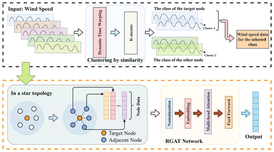 Specifically, this study uses the dynamic time warping algorithm to calculate the similarity between wind speed sequences in different sea areas, and then classifies the wind speed sequences into clusters based on spatio-temporal characteristics using K-means clustering. This groups wind speed data from the same category for the target node into one cluster. Next, we construct the topological structure of the graph network with the target node at the center connected to other nodes, forming a star-shaped topology. Residual connections are introduced to alleviate the gradient vanishing problem in deep graph networks. On this basis, we design a multi-headed attention mechanism to capture correlations between different sea areas. Comparative experiments validate the effectiveness of the proposed method and compare it with conventional time series based approaches. Results show that graph neural networks fused with multi-headed attention can significantly improve wind speed prediction accuracy under complex marine meteorological conditions. This study provides an innovative approach to improving marine meteorological forecasting with broad application prospects in fields like marine resource management and meteorological disaster warning. A schematic of the proposed model workflow is shown in Figure 2.