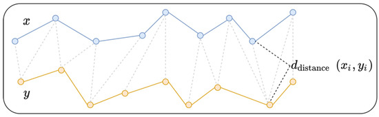 DTW is a measure of the distance between two time series, where each data point in one time series can be matched to multiple data points in the other time series. This enables DTW to compute the distance between time series of differing lengths [32]. Figure 3 illustrates the calculation of distance between two time series objects with unequal temporal durations.