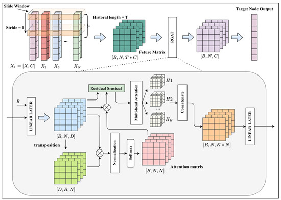 First, the original dataset is converted into a feature matrix using a sliding window method and input to the RGAT network structure. In the network structure, a linear transformation is first performed to generate a hidden matrix. The hidden matrix and its transpose matrix are then used to generate an attention matrix. The attention matrix and hidden matrix are then input to a residual structure. The output of the residual structure is then input to a multi-head attention mechanism. Finally, a linear transformation is performed to obtain the output matrix.