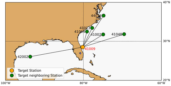 In order to enhance the accuracy of future graph network predictions, it is necessary to establish a clear definition of nodes and edges. Each buoy within cluster K = 4, including Buoy 41009, will be denoted as a node within the graph. The core node for the cluster will be Buoy 41009, with other buoys in the cluster connecting to it. This will result in a star-shaped topology, as depicted in Figure 6.