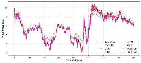 The purpose of these experiments was to compare and contrast the performance of these networks with the proposed DK-RGAT model. The parameters are defined below. The DK-RGAT model incorporates two multi-head attention heads. Each CNN layer is equipped with 64 convolution kernels of size 1, employing Rectified Linear Units (ReLU) activation and causal padding. The hidden units of the LSTM, GRU, and Bi-LSTM layers are set to 64. The dropout rate is 0.3. The training parameters for all models are the same. The experiment consists of performing 100 iterations using the Adam optimizer with a batch size of 64. The time window size is set to 6 for the training set and the test set, that is, using the past 6 time points to predict one point in the future.