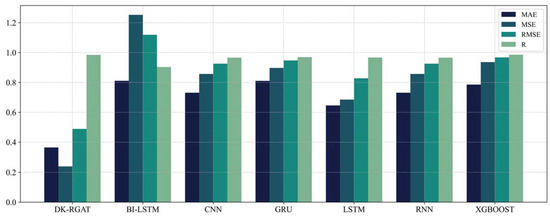 In relation to the metric of MAE, the DK-RGAT model has an MAE value of 0.364, which is notably reduced by 43.7~55.1% compared to alternative models. The MSE of DK-RGAT, which is 0.239, exhibits a reduction of 65.1~80.9% compared to other models. In relation to the RMSE, the value of 0.489 achieved by DK-RGAT exhibits a reduction of approximately 40.9~56.3% when compared to the values obtained using other models. The correlation coefficient (R) of DK-RGAT (0.985) is marginally greater than that of BI-LSTM (0.903), CNN (0.966), GRU (0.970), LSTM (0.967), RNN (0.966), and XGBoost (0.982).