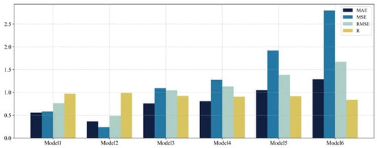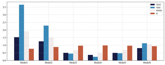 With respect to the metric of Mean Absolute Error, Model 2 has an MAE value of 0.364, demonstrating a significant reduction ranging from 45.0% to 83.7% when compared to alternative models. Model 2 demonstrates a Mean Squared Error of 0.239, indicating a reduction ranging from 65.9% to 91.4% in comparison to alternative models. With regards to the Root Mean Squared Error, Model 2 has attained a value of 0.489, indicating a reduction of around 27.8~68.6% compared to the values produced by other models. The correlation coefficient of Model 2 (0.985) exhibits a slight superiority compared to Model 1 (0.971), Model 3 (0.922), Model 4 (0.904), Model 5 (0.916), and Model 6 (0.834).