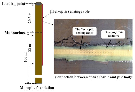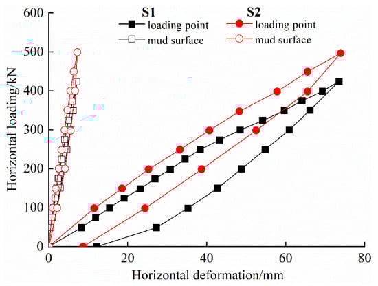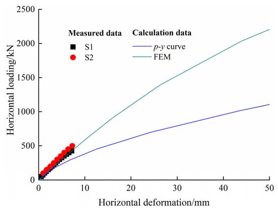- The testing pile under horizontal loads presents the typical response of a flexible pile, with the influence range of horizontal loading limited to 5.7 D below the mud surface. The loaded indicator of the testing pile shows a significant linear response with the increase in the loading, i.e., the pile head displacement, bending moment, and deformation of the pile. In addition, the maximum bending moment of the pile gradually moves down with the increase in horizontal loading and tends to be a stable value up to 1.1 D below the mud surface.