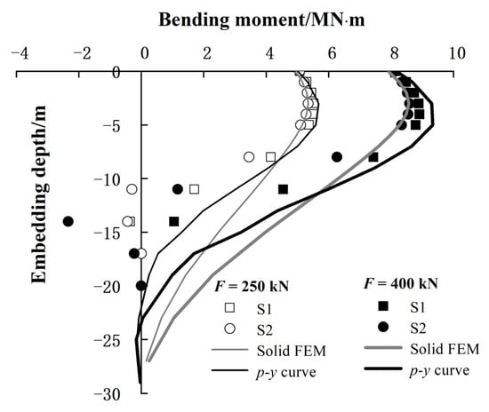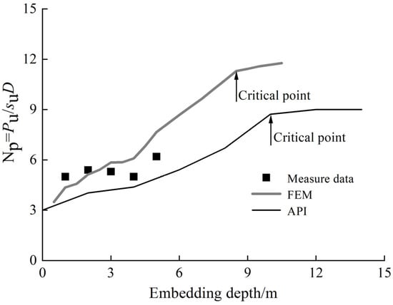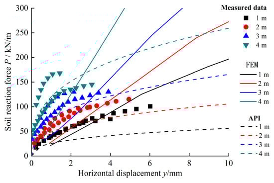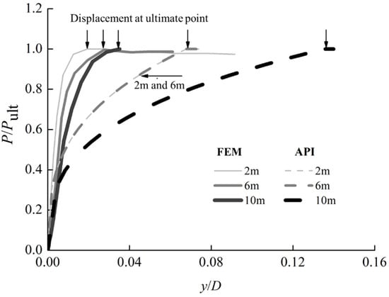 - The reason for the significant difference between the p-y curve method recommended by the API specification and the solid finite element method is that the stiffness of the p-y curve method recommended by the API specification is significantly lower than that of the finite element method, and its displacement corresponding to the ultimate soil reaction (over 0.65 D) is much larger than that of the solid finite element method (about 0.03 D). Moreover, the stable value of the ultimate reaction () calculated by the solid finite element method is close to 12, which is significantly higher than the recommended value of 9 in the API specification.
