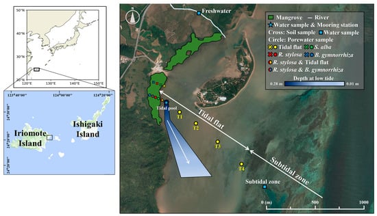 This study was carried out on the Yubu coast of Iriomote Island, Okinawa, Japan, located at the northern limit of mangrove distribution within the Indo-Pacific region (Figure 1). The Yubu coast serves as a typical example of a fringe mangrove forest, characterized by mangrove communities aligned parallel to the shoreline. The elevation of the mangrove edge along the shoreline was 28 cm above mean sea level []. During low tide, there is an approximately 1 km expanse of a tidal flat that separates the mangrove area from the adjacent ocean. The mangrove area, estimated using Google Earth’s polygon function, is 11.3 ha. The dominant mangrove species are Rhizophora stylosa and Bruguiera gymnorrhiza []. Along the Yubu coast, the mangroves exhibit a distinct zonation pattern, with different species occurring sequentially from the seaward side to the landward side, namely Sonneratia alba, R. stylosa, and B. gymnorrhiza, respectively (Figure 1). The maximum tree height of S. alba, R. stylosa, and B. gymnorrhiza are 5.7 m, 5.7 m, and 11.1 m, respectively []. Behind the mangrove forest lie agricultural fields.