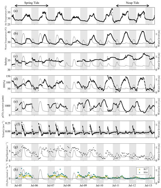 Time series observations of (a) is air temperature, (b) is water temperature, (c) is salinity, (d) is DO, (e) is pCO2, (f) is current velocity, (g) is wind speed, and (h) is CO2 flux. Grey lines indicate water level change. The grey bands represent the nighttime portion of the diurnal cycle. A positive current velocity means northward flow. A positive CO2 flux value means the CO2 flux from water to air. R17 and H16 indicate different gas transfer velocity models by Rosentreter et al. (2017) [] and Ho et al. (2016) [], respectively.