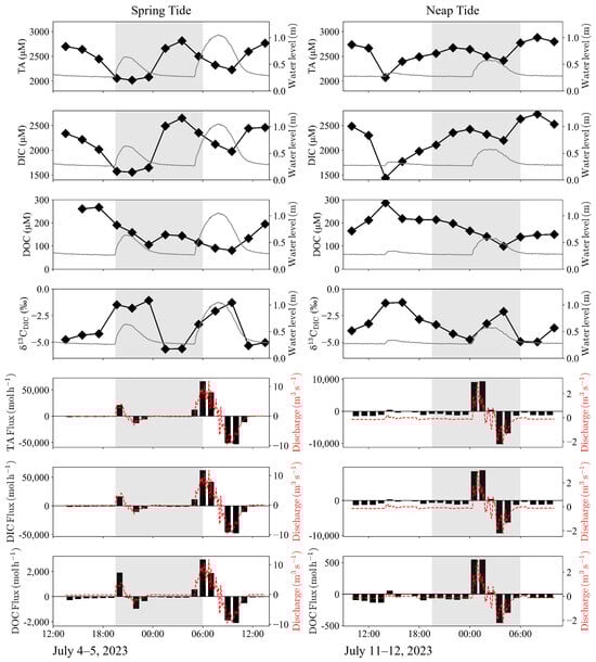 Diurnal variations in TA, DIC, DOC, and δ13CDIC at the blue star in Figure 1 and their lateral fluxes on the Yubu coast. The grey and red lines indicate water level change and discharge, respectively. The grey bands represent the nighttime portion of the diurnal cycle. Positive fluxes and discharge mean the input to the mangrove forest.