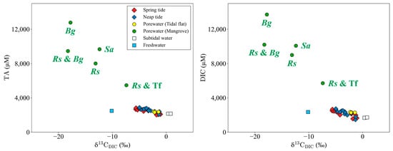 The relationship between δ13CDIC vs. TA and DIC for all water samples. Green and yellow circles mean porewater samples in the mangrove and tidal flat, respectively. Bg, Rs, Sa, and Tf represent samples collected around B. gymnorrhiza, R. stylosa, S. alba, and tidal flat dominated areas, respectively (Figure 1).