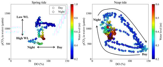 DO also showed pronounced diurnal oscillations (Figure 2d). The mean DO was 81.90 ± 19.72% during the spring tide, whereas it amounted to 75.33 ± 36.3% during the neap tide, displaying a significant difference (p < 0.01, t-test) (Table S2). The standard deviation was particularly large during the neap tide, with a maximum DO value of 124.84% during the spring tide, but reaching 146.23% during the neap tide, indicating oversaturation due to photosynthesis. In contrast to DO, pCO2 exhibited semi-diurnal oscillations following the tidal cycle (Figure 2e). The mean pCO2 value over the entire period was 923 ± 318 μatm, with the highest readings typically recorded during low tide (Figure 2e). After 10th July, however, pCO2 decreased during the day despite low tide (Figure 2e). DO was oversaturated at this time (Figure 2d).