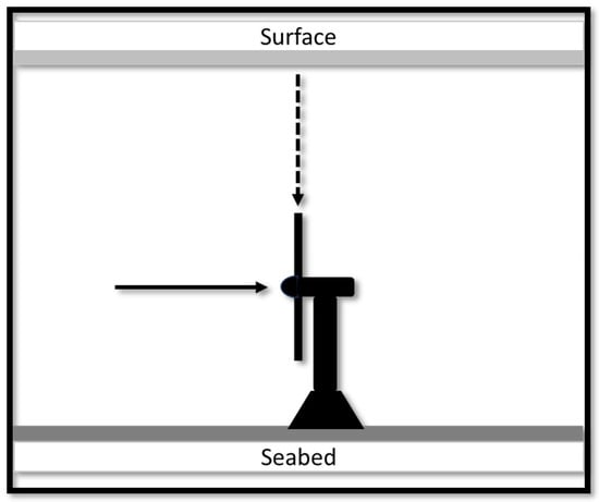 Diagram demonstrating the two approach angles assessed, the horizontal approach (solid arrow) and vertical approach (dashed arrow) in relation to the surface, seabed, and the TEC.