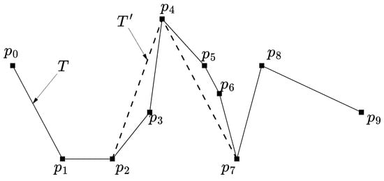 is said to be a simplification of T, is in the form of , where and . Note that and in T must be kept in any simplification of T. is using segments to represent T containing segments. Consider our running example. Let . is a simplification of T in Figure 1. The size of is 7. is using 6 segments to approximate 9 segments in T. Consider segment in , which is used to approximate the sequence of segments between and in T. In other words, the and segments are approximated by a single segment .