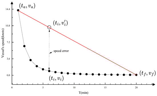 Illustration of the speed error between the original speed and speed from interpolation. The black dots represent the ship’s speeds at the corresponding moments, and the red line represents the linear change of the speed from the starting point to the end point, after compress the trajectory, we can find the ship’s speeds at through the linear interpolation(the white circle on the red line). The speed error at is .