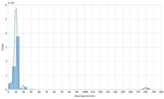 In theory, the receiving time interval of adjacent track points of the same ship will not exceed 3 min, that is, a ship that is at anchor or one that is moored and not moving faster than 3 knots. In order to verify the actual situation, we randomly selected 100 ship trajectories in the study waters for receiving time interval statistics. The count of the points was 6,371,875. The smallest receiving interval was 0 s, that is, the ship with the same MMSI number had at least 2 points at the same time. The maximum receiving interval was 2,126,683 s, the main reason for this was that certain vessels re-entered the area after leaving, thus resulting in a long receiving interval between two adjacent track points. In the statistical samples, 95% of the receiving intervals were less than 21 s, 99% of the receiving intervals were less than 181 s, and 99.9% of the receiving intervals were less than 360 s. As shown in Figure 4, the receiving time interval of track points is mainly concentrated around 10 s, but there are also some data around 180 s, and the statistical results are basically consistent with the theoretical report interval. When comprehensively considering the theoretical report interval and statistical results, 360 s was determined as the time threshold to split the trajectory, that is, sort the AIS trajectory by time. If the receiving interval of two adjacent points was greater than 360 s, then the trajectory was split. The pseudo-code of the trajectory slice is shown in Algorithm 1.