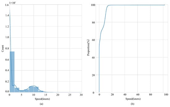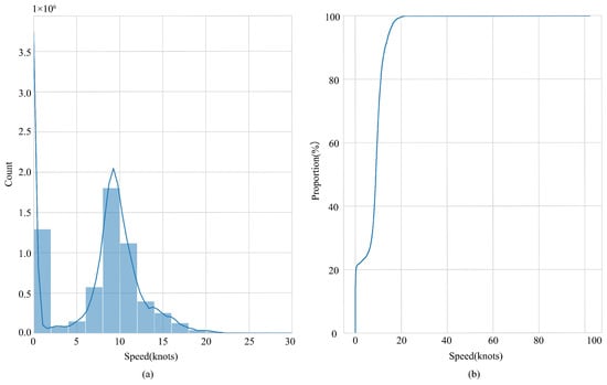 Statistical results of the speed distribution in coastal waters. (a) Frequency distribution chart of the different speeds. (b) Cumulative frequency distribution chart of the different speeds.