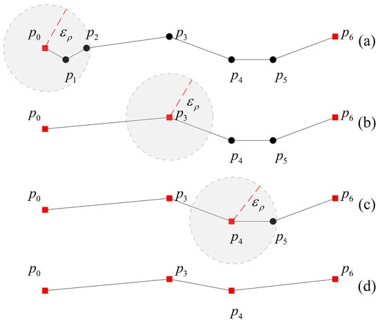 Theoretical schematic of the radial distance method to deal with the low-speed AIS trajectory points. In (a), the distance from , to are less than , so these two points are deleted. In (b), is the key point, and no points were deleted. In (c), is the key point, and the distance from is less than , so is deleted. In (d), after the radial distance method, the remaining points were .