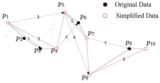 An AIS trajectory is represented by a sequence of n points in the form of , where is the timestamp, is the longitude at time , is the latitude at time , and is the speed of the ship at time . We define the ship’s dynamic information for each . Then, the trajectory T can be expressed as . The size of T, denoted by is defined to be the point number of trajectory T. Consider a running example, such as the one shown in Figure 1. In the figure, the original trajectory T is represented in the form of , and the size of the trajectory is 10.