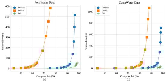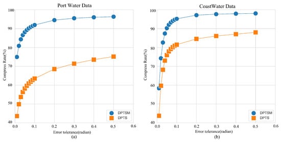 Comparison of the compression rate between the proposed method (DPTSM) and the DPTS method with the same tolerance. (a) Comparison of the rate in port waters. (b) Comparison of the rate in coast waters.