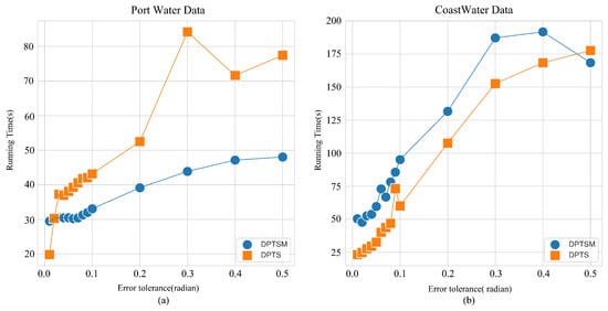 Comparison of the running time between the proposed method (DPTSM) and the DPTS method with the same tolerance. (a) Comparison of the running time in port waters. (b) Comparison of the running time in coast waters.