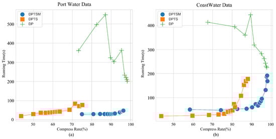 Comparison of the running time between the proposed method (DPTSM), the DPTS method, and the DP method with the same compression rate. (a) Comparison of the running time in port waters. (b) Comparison of the running time in coast waters.