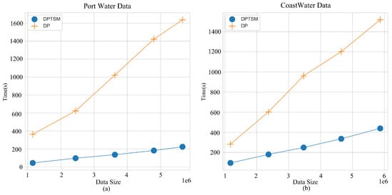 Comparison of the running time between the proposed method (DPTSM) and the DP method with the same compression rate (95%) for different data sizes. (a) Comparison of the running time in port waters. (b) Comparison of the running time in coast waters.