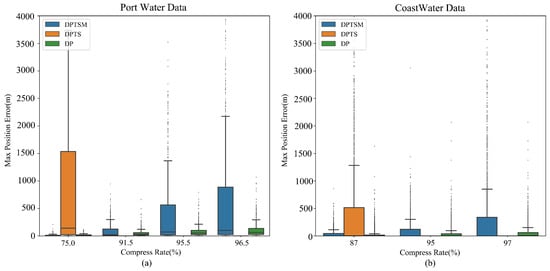 Comparison of the max position error between the proposed method (DPTSM), the DPTS method, and the DP method with the same compression rate. (a) Comparison of the max position error in port waters. (b) Comparison of the max position error in coast waters.