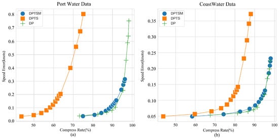Comparison of the average speed error between the proposed method (DPTSM), the DPTS method, and the DP method with the same compression rate. (a) Comparison of the average speed error in port waters. (b) Comparison of the average speed error in coast waters.